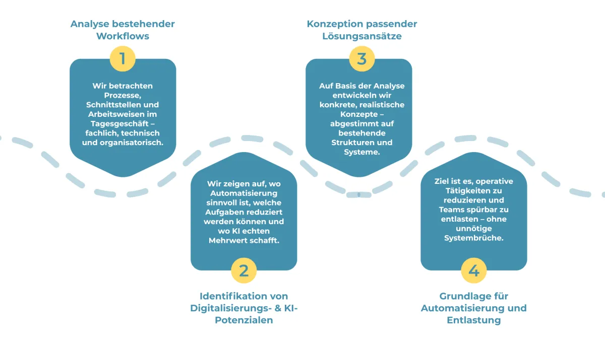 Bestehende Abläufe werden analysiert und als Grundlage genutzt, um realistische und umsetzbare Digitalisierungsansätze zu entwickeln – ohne unnötige Umbrüche.